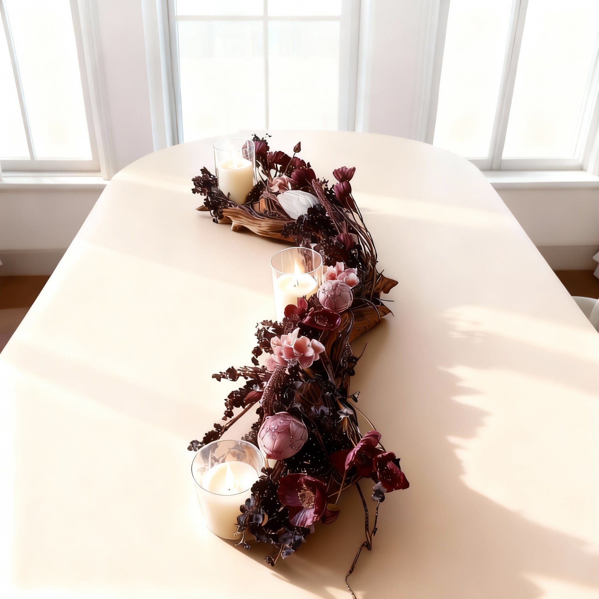 Charming Dining table arrangement paired with 1 Driftwood, 1 Magnolia Vine, 3 Glass Hurricane Candleholders, and 3 wax Flameless Pillar Candles. Enhance your dining table decor with a floral centerpiece creating a warm and inviting atmosphere. Everyday dining ornament decor for all seasons.