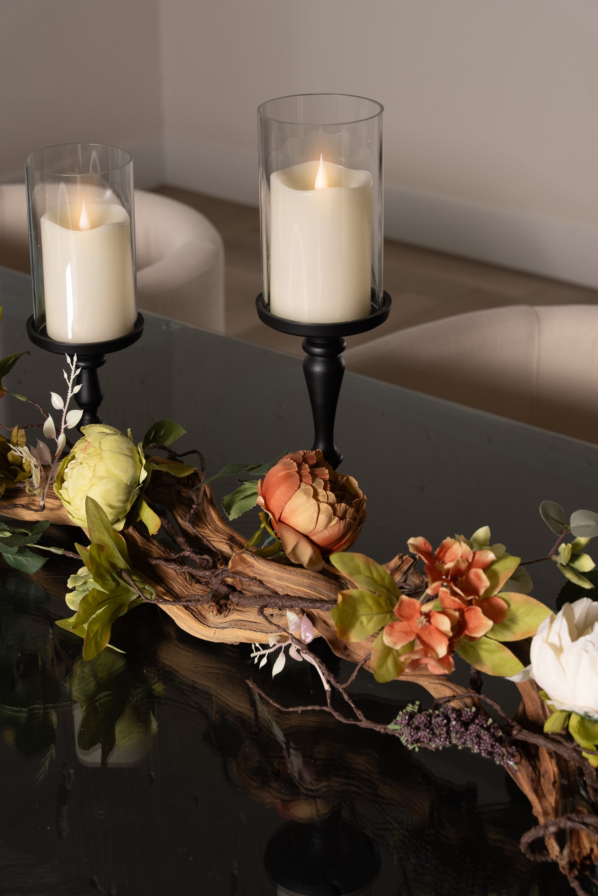 Elevate your dining table arrangement with a breathtaking driftwood centerpiece, featuring natural manzanita driftwood, vintage peony vine, 3 black iron candle holders and 3 flameless pillar candles. This elegant decor piece adds a touch of nature’s beauty to any setting and makes a thoughtful gift for any occasion.