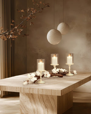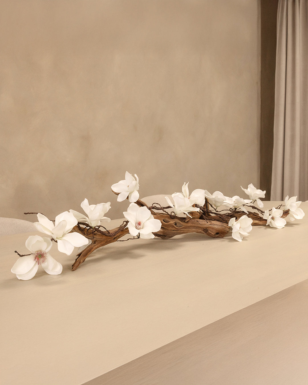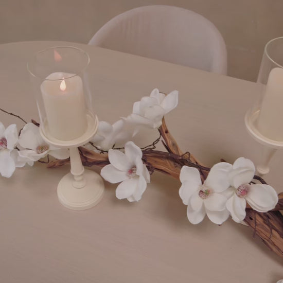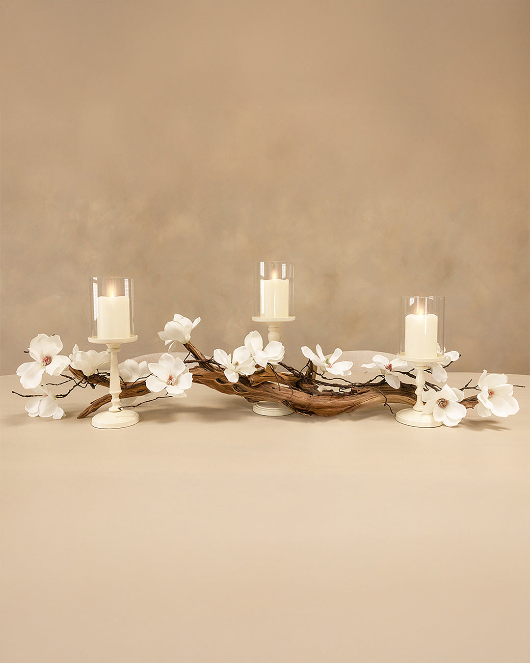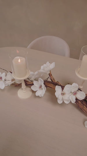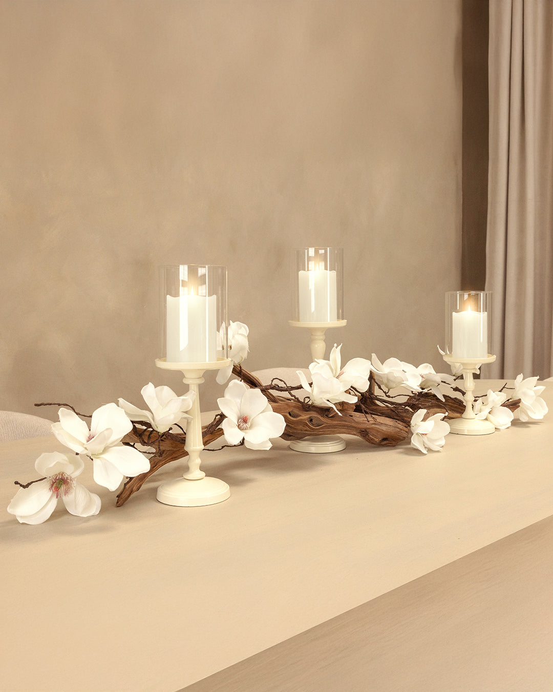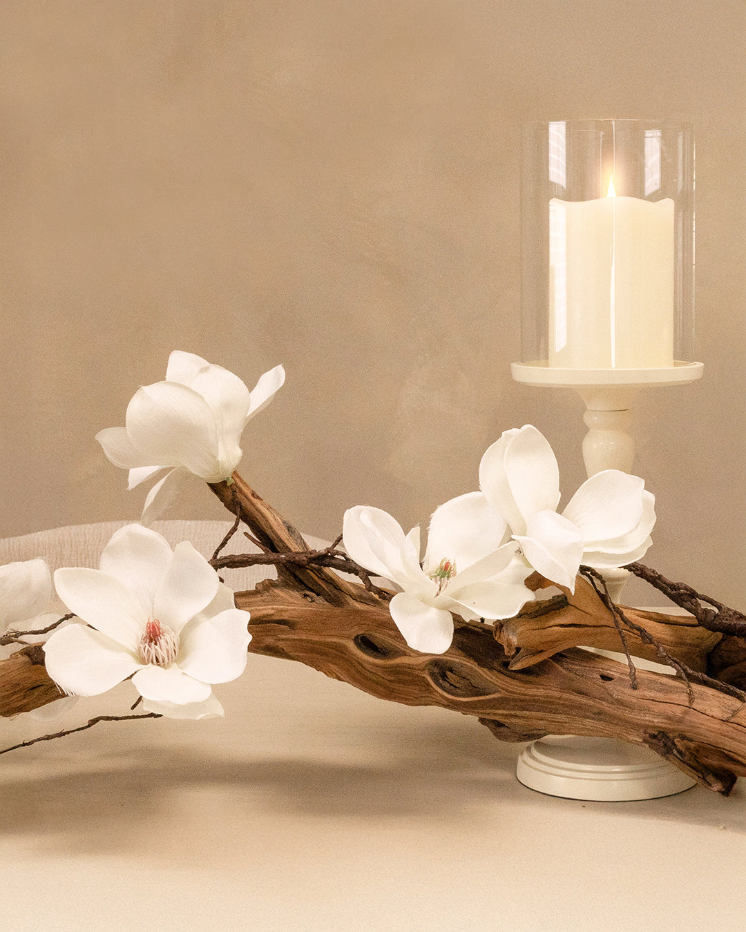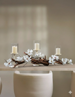 Charming Dining table arrangement paired with 1 Driftwood, 1 Magnolia Vine, 3 Glass Hurricane Candleholders, and 3 wax Flameless Pillar Candles. Enhance your dining table decor with a floral centerpiece creating a warm and inviting atmosphere. Everyday dining ornament decor for all seasons.