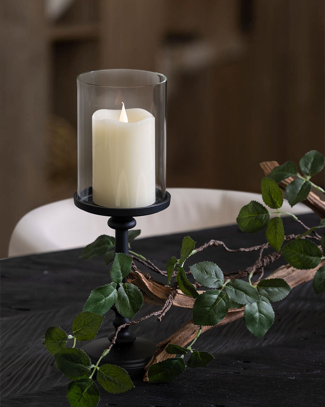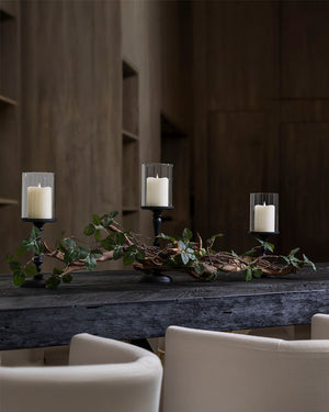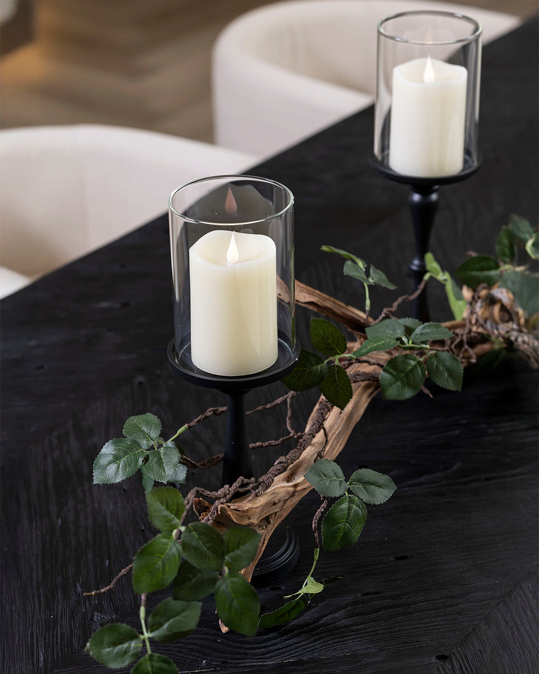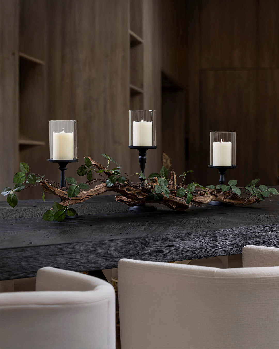 Elevate your dining space with this exquisite Natural Manzanita Driftwood Dining Table Centerpiece, gracefully paired with lush green artificial vines. Real wax flameless pillar candles nestle within elegant black iron hurricane candleholders, casting a warm and inviting glow. The addition of a plant ivy arrangement completes this enchanting table decoration, blending rustic charm with timeless sophistication to create a captivating centerpiece for any occasion.
