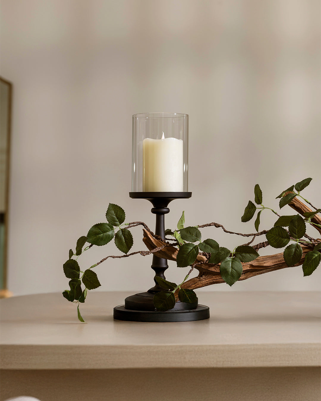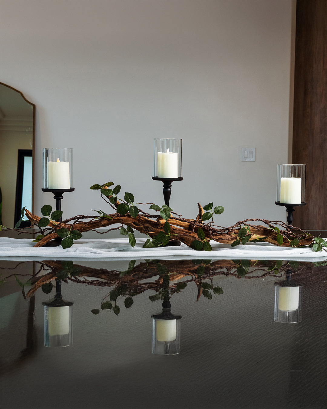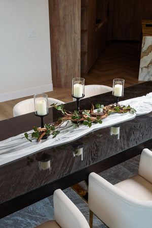 Enhance your dining table with a stunning green leaf vine and driftwood centerpiece. Blending an delicate artificial vine with iron hurricane candleholders, creating an enchanting arrangement that warmly invites you in. The vine accent brings a touch of nature to your home decor, while 3 pillar candles add an inviting warm glow, perfect for your most memorable gatherings.